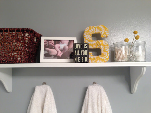 And now, the shelf and towels. Those towels!!! I am in LOVE!! I actually saw these babies on a few different bathroom makeover blogs and I coveted them! The bloggers said they got them from World Market. I went to worldmarket.com and it said this item was no longer available. I googled them and 'decorative yellow and white towels' and was having no luck! I stopped by the World Market closest to us and GUESS WHAT! These were on the clearance rack! WHAT??!! You better believe the angels were singing from Heaven and there was a light shining down directly on them! HALLELUJAH! I snatched up these, the hand towels, and washcloths! Yes please! can you tell i was am a little excited?